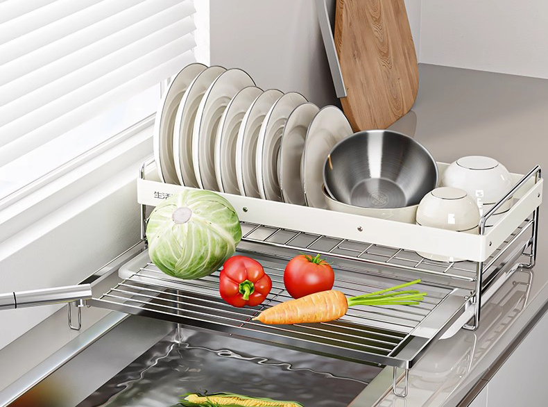 ประการที่สอง ระบบระบายน้ำแบบบูรณาการป้องกันการรวมตัวของน้ำ ซึ่งเป็นอีกสาเหตุหนึ่งของความยุ่งเหยิงที่ซ่อนอยู่ ชั้นวางแบบธรรมดามักจะปล่อยให้น้ำหยดลงบนเคาน์เตอร์ โดยต้องใช้ถาดรองน้ำหยดแยกต่างหากซึ่งจะเพิ่มความเลอะเทอะ โดยทั่วไป รุ่นประหยัดพื้นที่จะมีถาดลาดเอียงในตัวที่ส่งน้ำเข้าสู่อ่างล้างจานโดยตรง หรือถาดรองน้ำหยดแบบถอดได้ซึ่งพอดีกับใต้ชั้นวางอย่างเรียบร้อย (โดยไม่ขยายเกินพื้นที่วาง) ทำให้ไม่ต้องใช้อุปกรณ์เสริมเพิ่มเติมและช่วยกักเก็บคราบสกปรกที่เกี่ยวข้องกับน้ำ