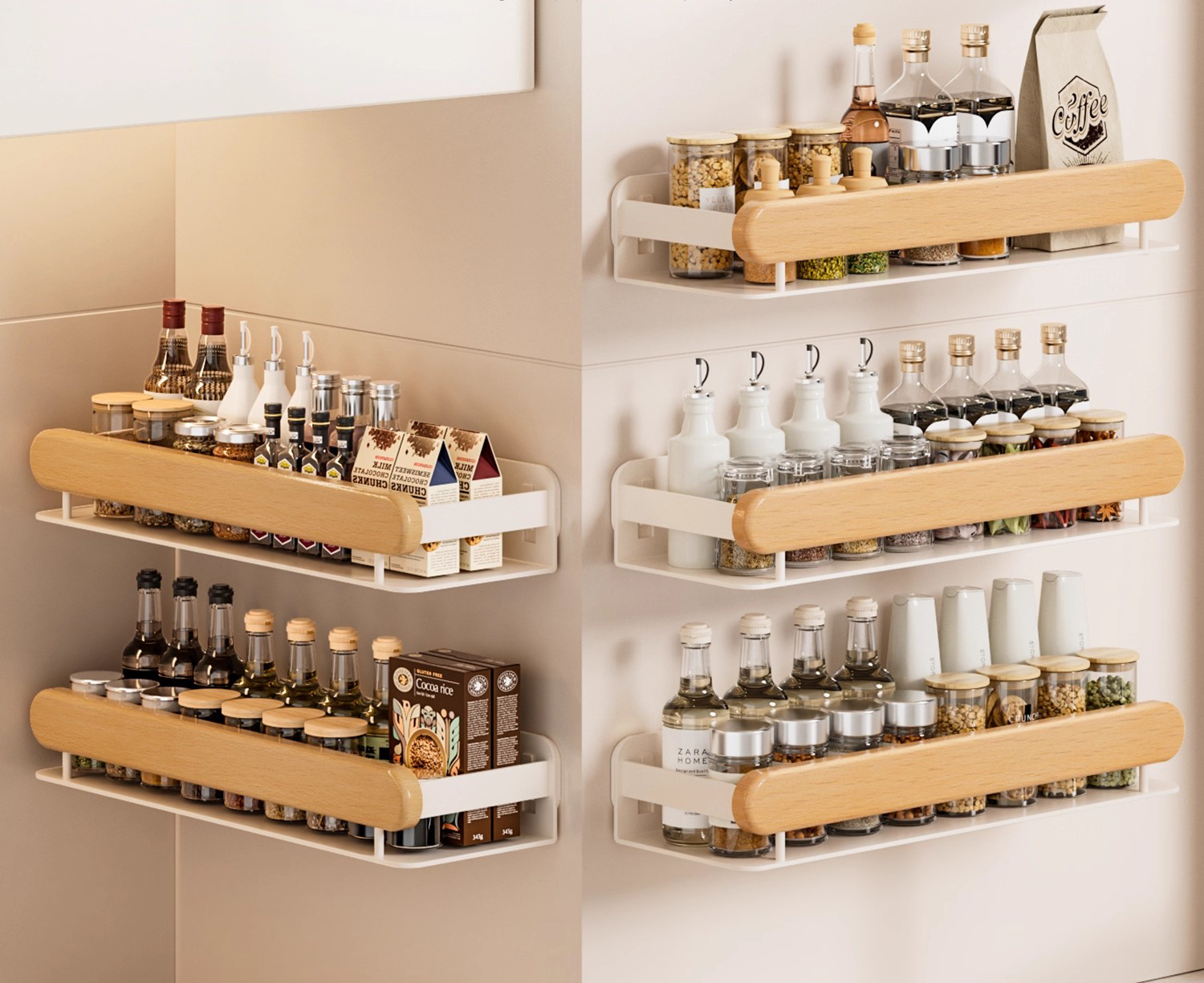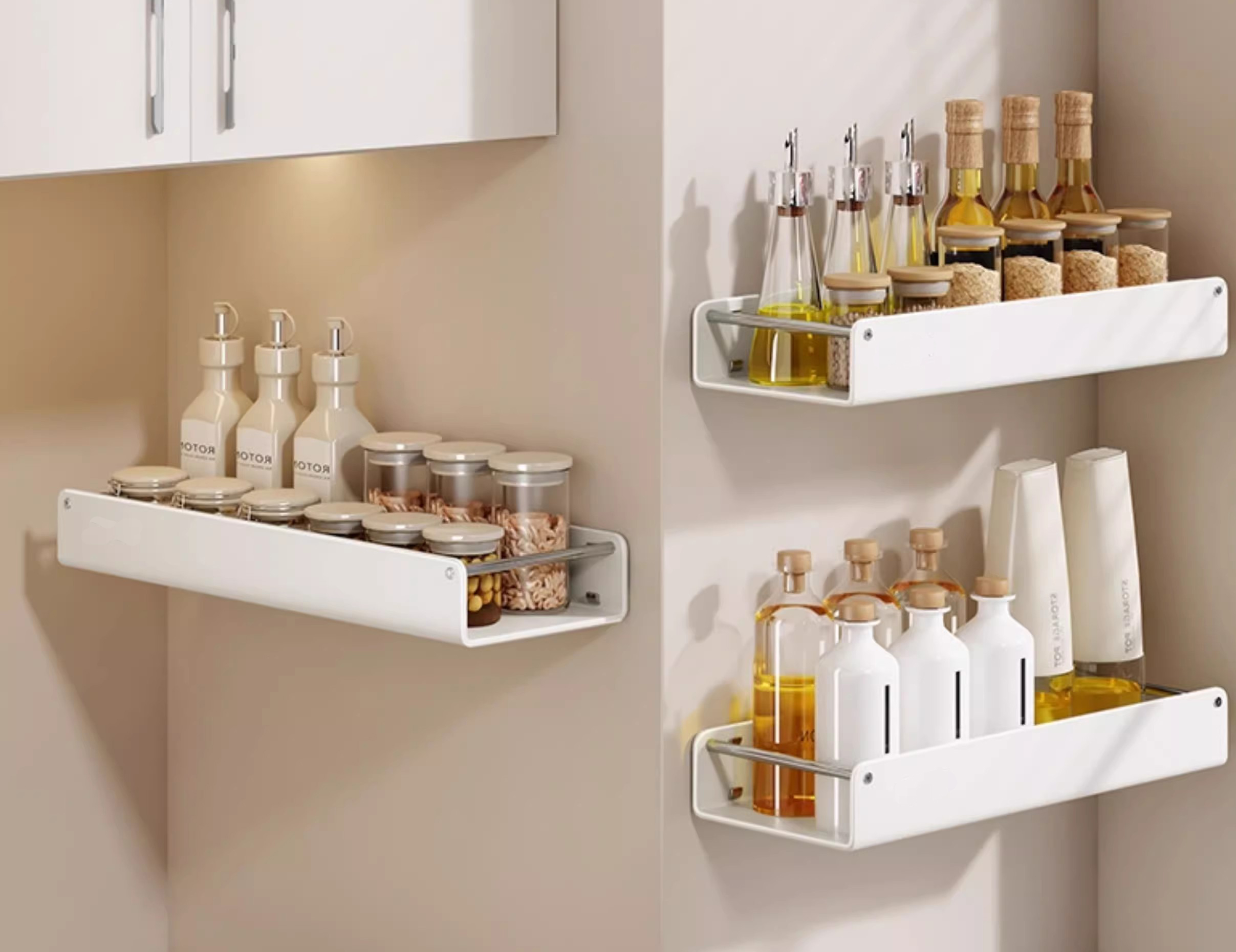 ชั้นวางติดผนังติดตั้งบนผนังโดยตรง เหนือเตาหรือข้างอ่างล้างจาน เพื่อไม่ให้ขวดปรุงรสอยู่นอกเคาน์เตอร์ สำหรับห้องครัวขนาดเล็กที่มีเคาน์เตอร์แคบ การออกแบบนี้สามารถเพิ่มพื้นที่เคาน์เตอร์ได้ 30%-50% เพียงพอสำหรับวางเขียงหรือหม้อขนาดเล็ก อย่างไรก็ตาม ยังมีข้อควรพิจารณาอีก เช่น หากผนังเป็นกระเบื้องหรือผนังยิปซั่ม การติดตั้งจะมั่นคงหรือไม่ ชั้นวางติดผนังส่วนใหญ่มาพร้อมกับกาวหรือสกรูยึดที่แข็งแรง ชั้นวางแบบมีกาวเหมาะสำหรับผนังกระเบื้องเรียบและสามารถรับน้ำหนักได้ 2-3 กก. ในขณะที่สกรูขยายจะดีกว่าสำหรับผนังแห้ง ช่วยให้มั่นใจได้ว่าชั้นวางจะไม่หลุดออกแม้จะมีขวดปรุงรสที่หนักกว่าก็ตาม นอกจากนี้ชั้นวางติดผนังต้องมีความสูงพอสมควร สูงเกินไป หยิบเครื่องปรุงไม่สะดวก ต่ำเกินไป อาจทำให้ท่อไอเสียอุดตันได้ โดยทั่วไปแนะนำให้ใช้ความสูงเหนือเตาประมาณ 50-60 ซม. เพื่อให้เข้าถึงได้ง่าย